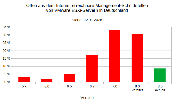 Das CERT-Bund des Bundesamts für Sicherheit in der Informationstechnik untersucht den deutschen Teil des Internets nach verwundbaren Diensten. Dabei kam es in der vergangenen Woche auf rund 2500 verwundbare VMware ESXi-Instanzen, deren Verwaltungsschnittstellen offen aus dem Internet zugänglich waren.